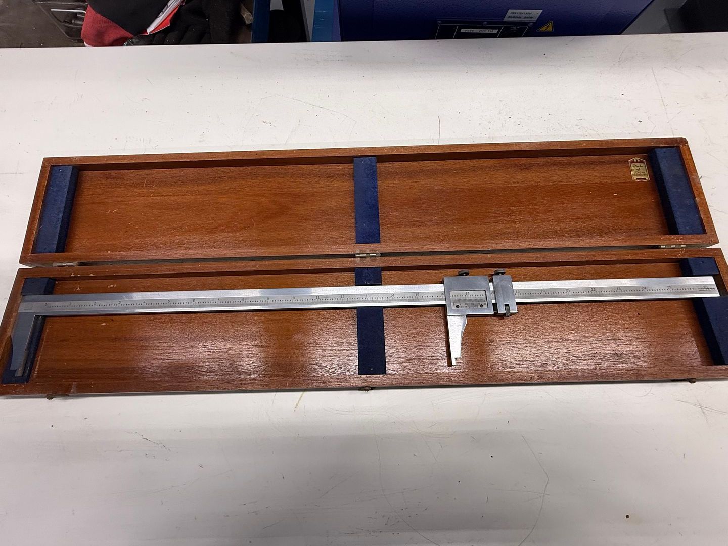 Once again, my faulty gene got the best of me.. I just acquired this antique Brown & Sharp 26" vernier caliper. Complete with the original genuine mahogany wood case. It's a newer model with recessed satin chrome scales that makes for easier reading and less vulnerable to wear from the sliding jaw. In mint condition showing little wear.