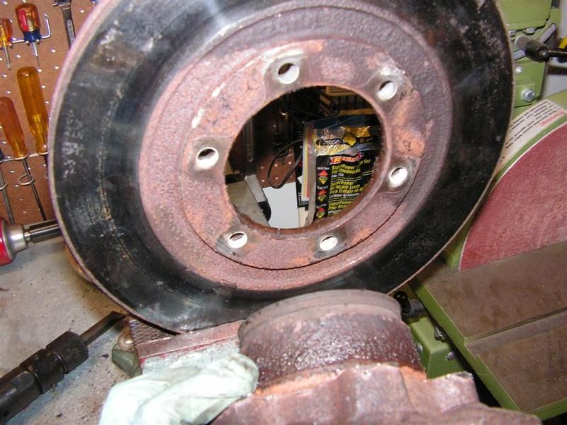 Although it doesn't look like much, but I've been working on this beast since 8:00AM this morning, and just finished up an hour ago. The problem was that the front pads had rusted in the calipers and both calipers were frozen on their sliders. So on one side the pads were eating up these rotors like a grinding wheel. The truck sat for nearly a decade so it's not uncommon for these calipers to just rust shut.