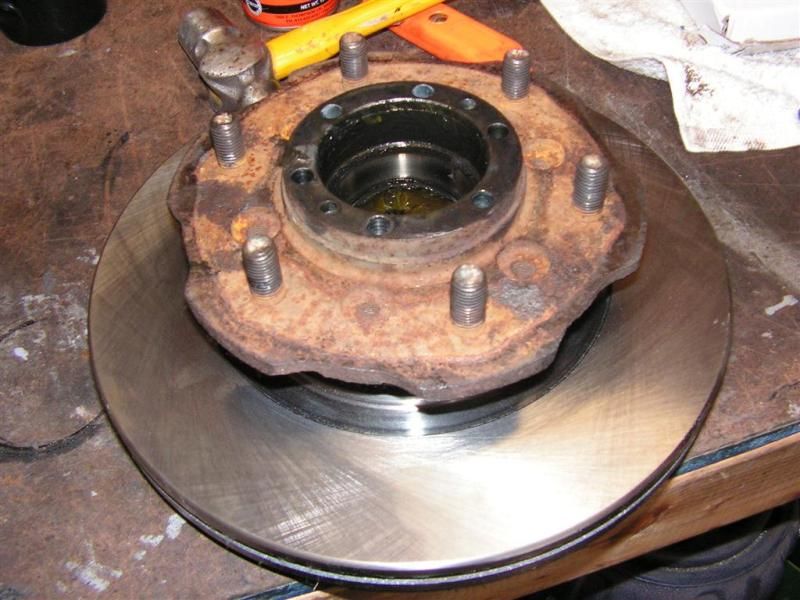 The hardest part is separating the rotor from the hub. Everything is rusted and corroded, so I just grabbed the air hammer and a flat chisel to split the hub from its rust bond with lots of impacts and vibration. It too about 15 minutes, but the hub eventually came loose.