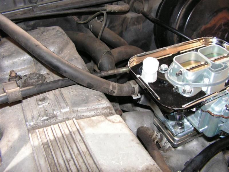 ADDITIONAL NOTE: This last step wasn't necessary. The Weber kit did include two large manifold plugs for plugging the two large ports in the exhaust manifold (one on top and the other towards the rear of the manifold). The best way to remove the old lines is to use a cutting wheel or sawz-all to cut the metal tubes right above the fittings, and then heat the fittings with an O/A torch to loosen and remove them. Without that O/A heat, no amount of penetrating oil would budge those rusted fittings.