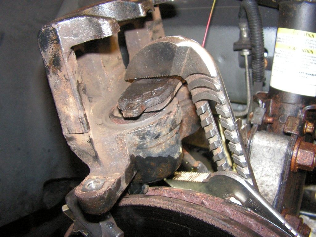 NOTE -- Just my preference, but I usually clamp off the brake line and open the bleeder nipple when retracting caliper pistons to avoid pushing old fluid back up into the master cylinder. Once I start compressing the piston, the old fluid just squirts into the catch pan on the floor.