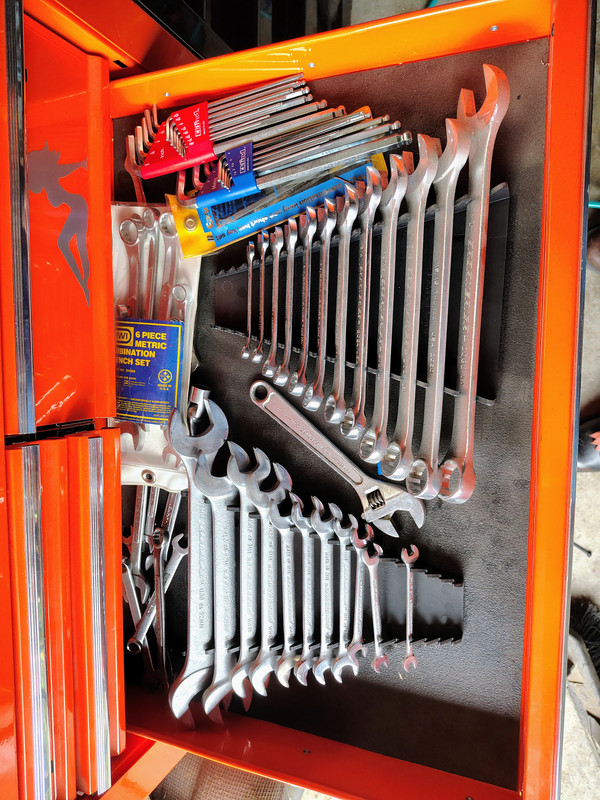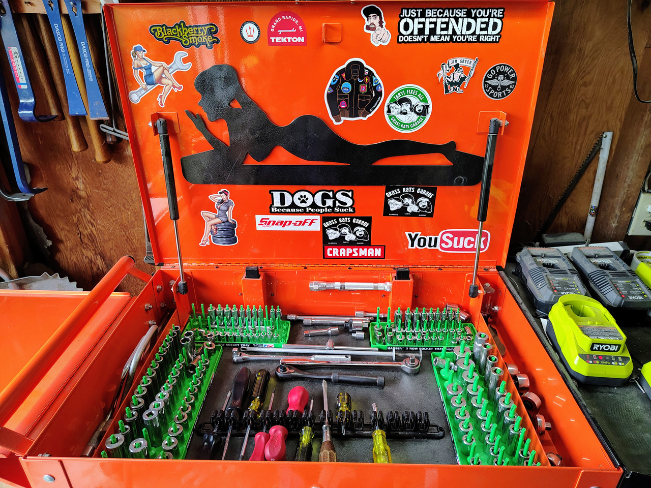 In the top I keep most of my sockets and primary user ratchets ( except for my 1/4dr kit )