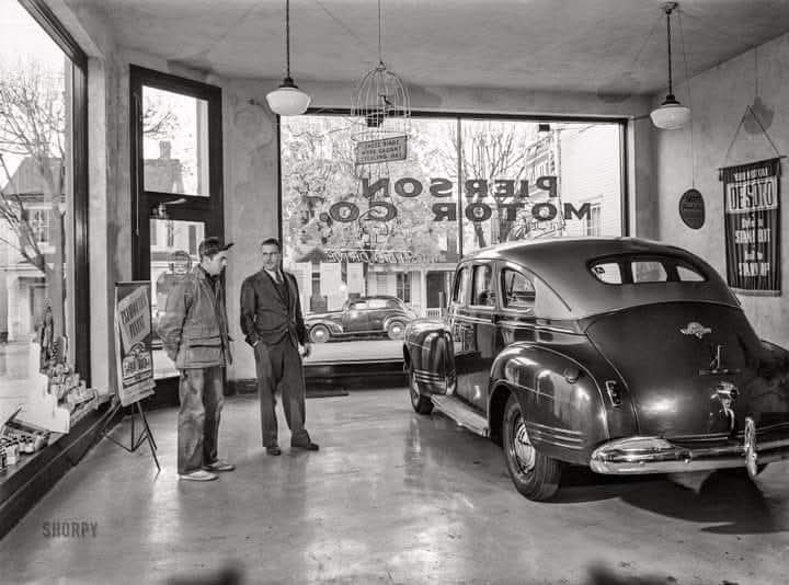 November 1942. "Lititz, Pennsylvania. Showroom of the Pierson Motor Company owned by Al Pierson, who is showing his one second-hand car to a local farmer. Before the war there always were three brand new cars in his showroom. Now the chief business of garages is repairing."