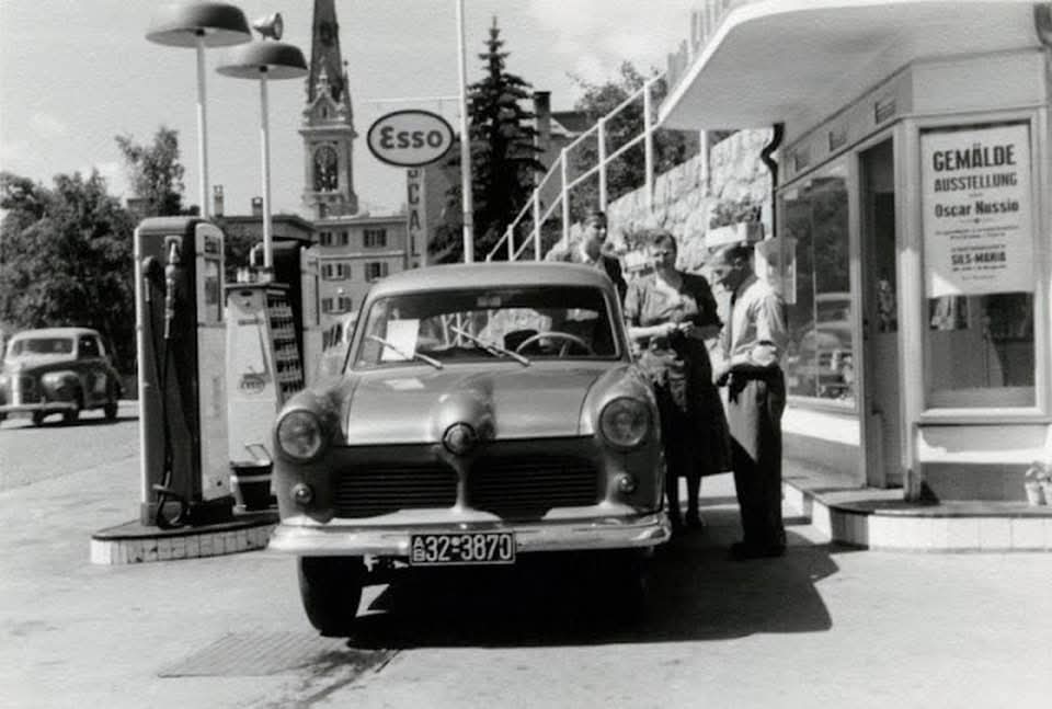 Interesting Photo! Not the car, (which BTW looks like a 1952 Ford Taunus 12M), but the license plate. After WWII when Germany was divided into four military administrative sectors (France, Britain, USA, and the Soviet Union), German automobile license plates were issued according to what sector you lived in. This one starts with A/B  -- American Sector/Bavaria.