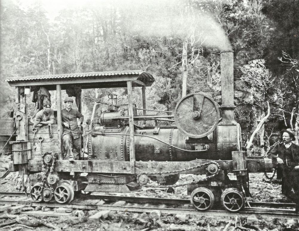 Charming Creek Tramway, West Coast of the South Island of New Zealand was built to haul native timber and later coal. Their second loco, built around 1910 was a self-made construction with a transportable Ruston & Procter boiler (works No. 8698 from 1897) and only one cylinder was built on a wooden frame. The flywheel crankshaft turned the drive shaft via a sprocket and chain, and this turned the two-axis bogies via another sprocket and chain