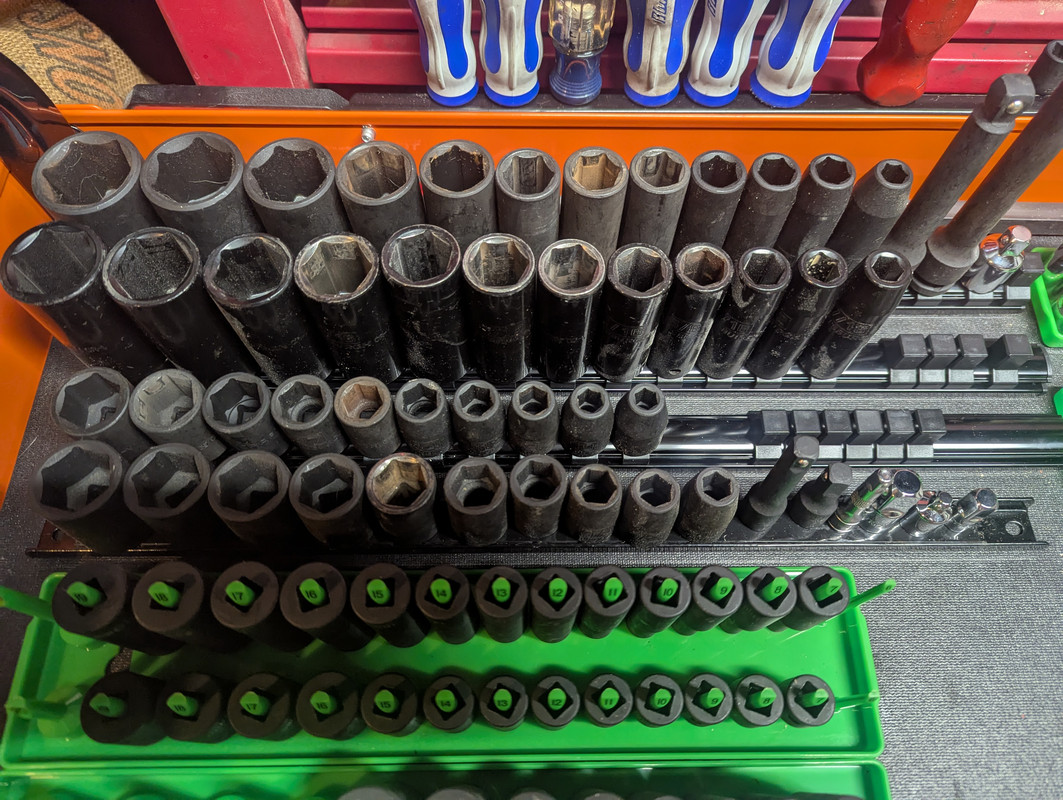 Due to the limiting factor of shallow drawers I have always kept all of my 1/2" drive stuff in the top till of my boxes. I don't like different drive sizes in the same drawers, and don't like to mix SAE and metric in the same storage. I keep all of my metric, sockets, wrenches, the whole shebang in a separate box from my main box. Same thing with body tools, and everything specialty in the way of hand tools like brake tools, etc. in their own separate top boxes. One for body tools, another for specialty stuff.