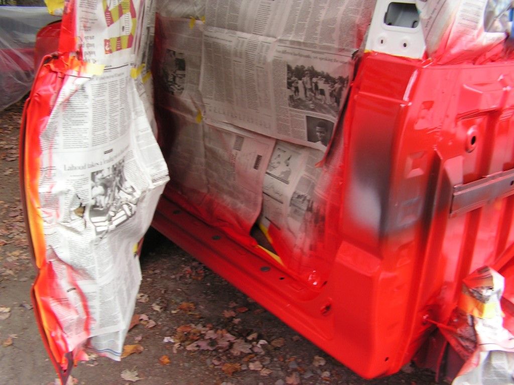 While everything was drying on the bed, I also cut in the fenders and cowl with red paint, and it was getting dark and colder I only had time to but in the drivers side sills with red.