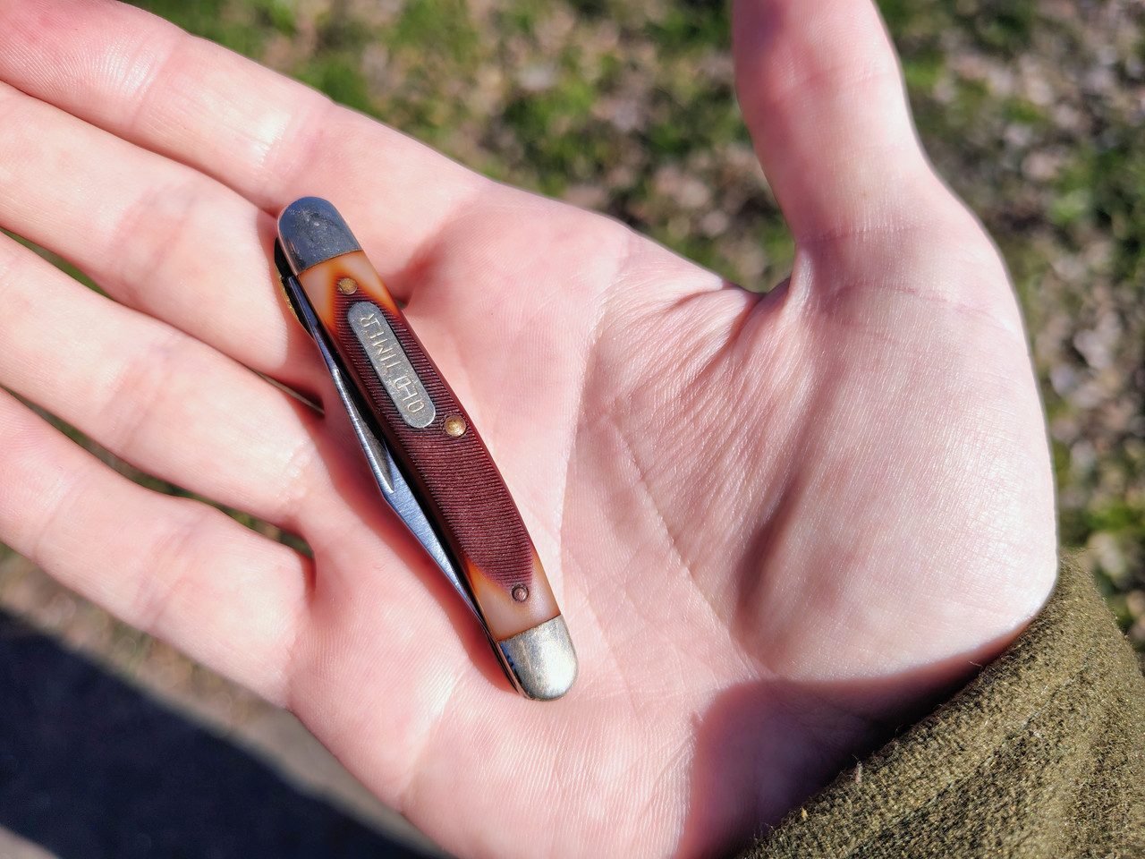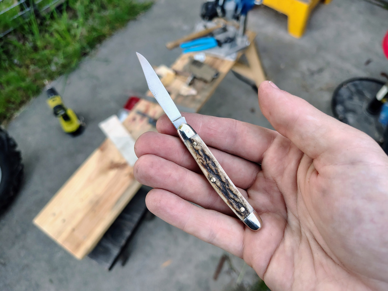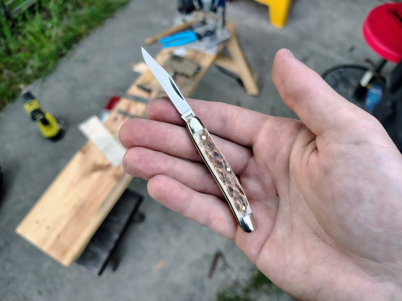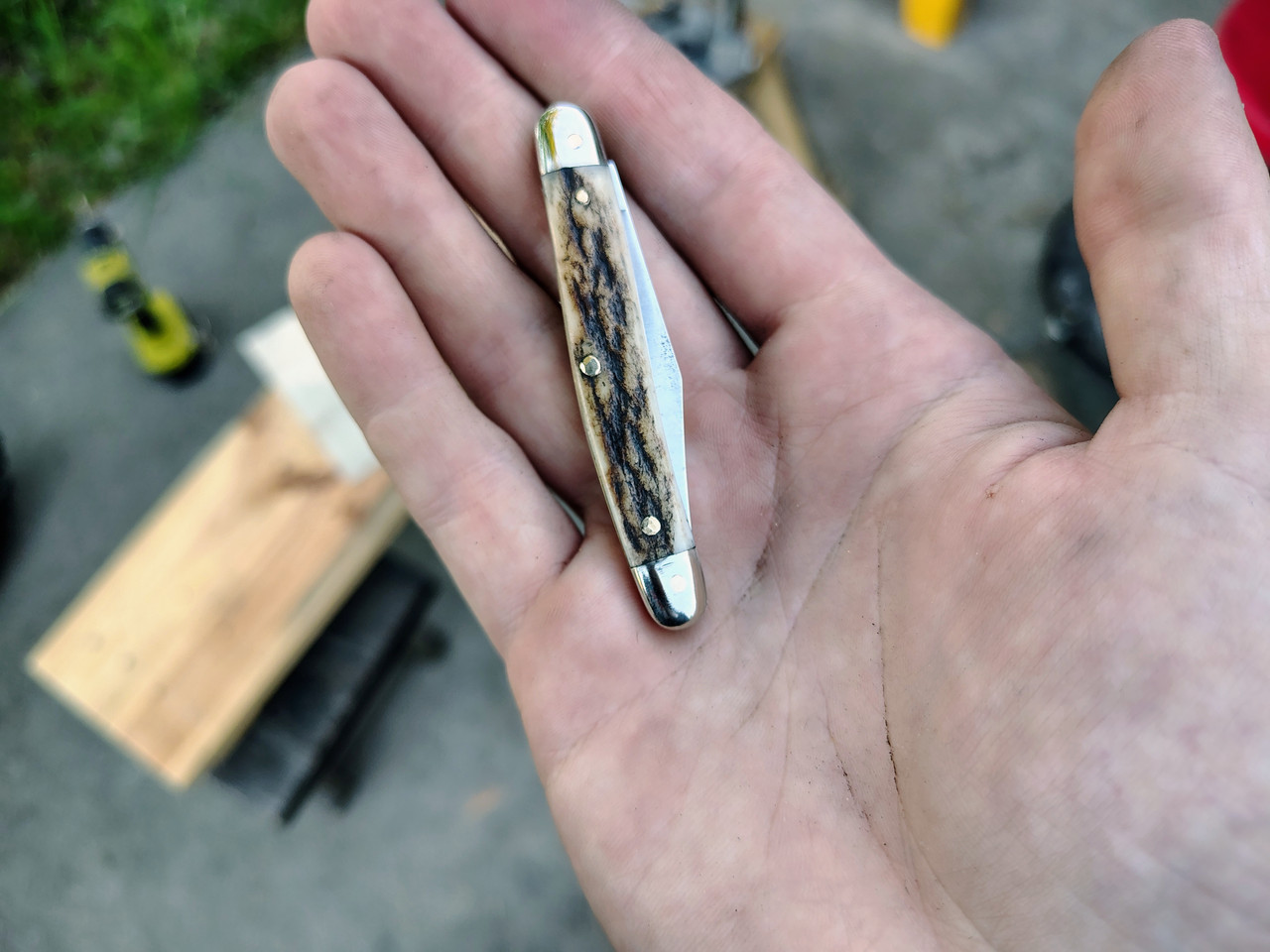 When I got off work today I took this little Schrade 18OT apart, eliminated the liner lock, converted it from a swinden key to conventional through pin construction, and replaced the delrin with stag.