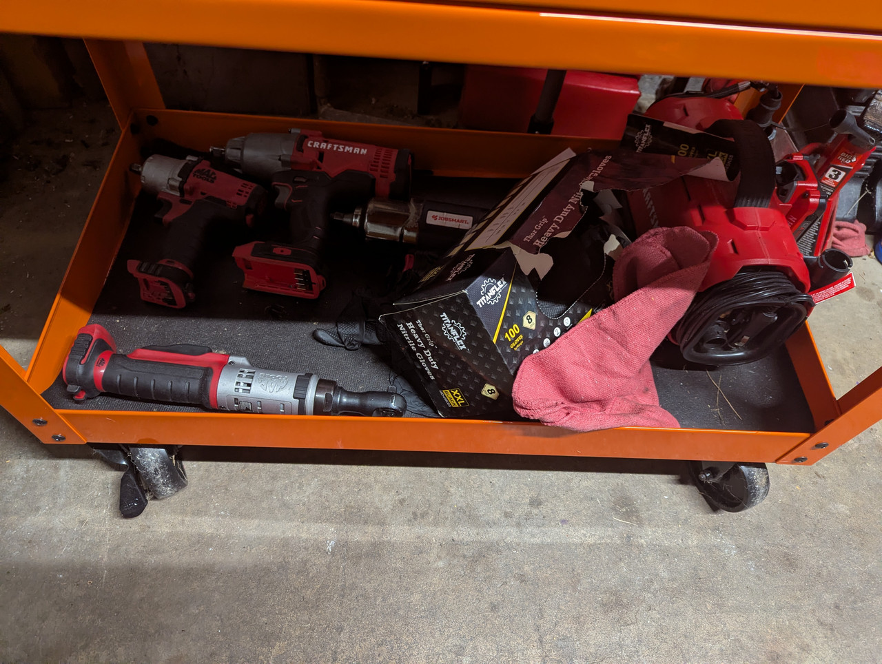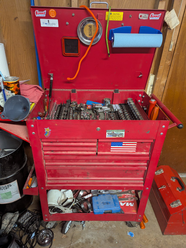 My setup at home. I take the orange cart out to the driveway to do work on the vehicles. The red box has a basic socket set screw drivers and pliers and less often used tools.