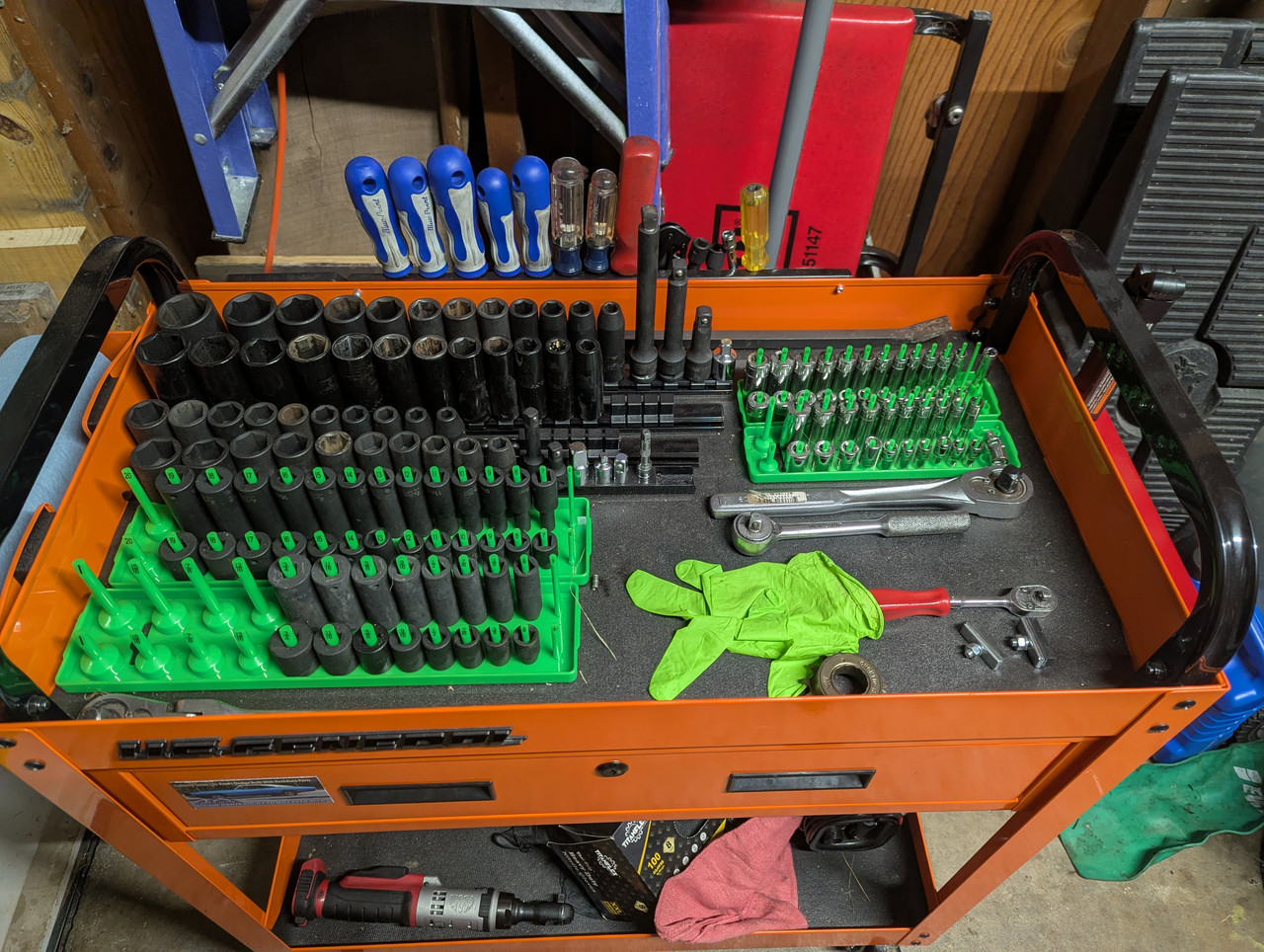 The other 3 drawers in the orange cart are mostly miscellaneous stuff, then in the black attachment I've got drill bits in the top my 1/4 ratchet drawer, other wrenches, then batteries and tools.