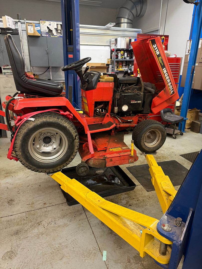 Last fall the 35 year old tractor had a major mechanical failure. The engine started to bog down and eventually quit. Now barely turns over. Put it on my lift to get it running for this season... Having it waist high makes it easier on my back and easy to get under.