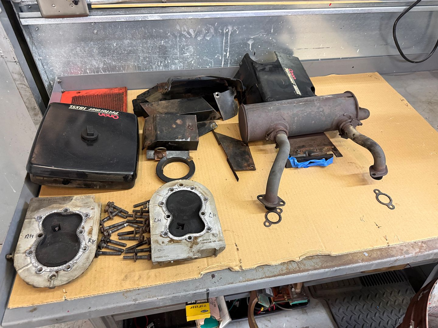 Spread out parts on a workbench..